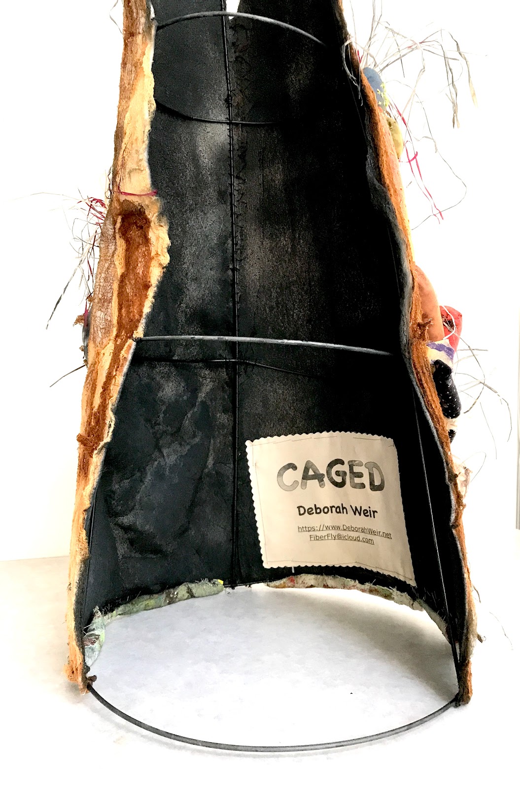 CAGED is my latest 3D piece. It refers back to the art quilts I did several years ago on the subject of incarceration. I came upon a rusty old tomato cage and knew right away that it was crying out to become a piece of art. I covered it on 2 of its 3 sides with Fosshape to act as a substrate for the textiles and stitching. To that I applied cheese cloth I'd dyed murky browns. Then I made warts and knobs and other oddments, mostly hand dyed, that I stitched into place through the open third. I spray painted the interior when all the stitching was complete. Getting it to balance was a bit of a trick, but it's very steady now. It stands just over 2' high.